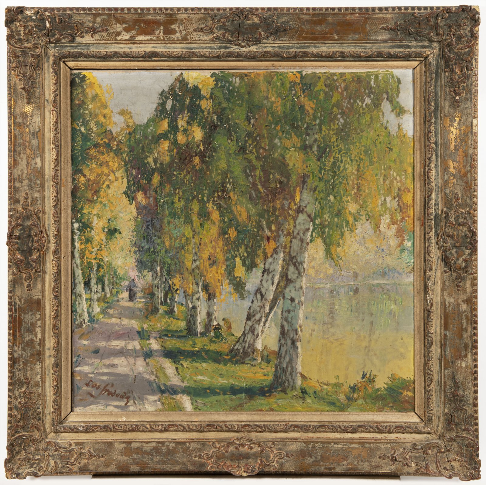 Josef Svoboda became famous mainly as a painter of seas, boats and travel motifs. The Birch Avenue is a rarer example of his work, where water is again the unifying element of the composition. The thoughtful impressionistic autumn landscape with the birch avenue is one of the most artistically brilliant works, the looser brushwork giving the painting an authentic atmosphere.