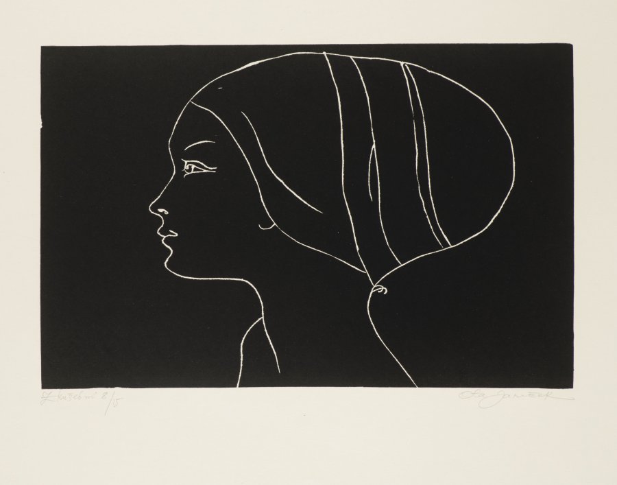 The portrait of a girl in a turban in black is by Ota Janeček, an important and multi-talented painter whose work was based on both domestic tradition and the legacy of European modernism. From the initial impulses of cubism, lyrical figuralism or French colourism, he turned his attention to his own unmistakable expression. His drawings and prints of female nudes are famous. The dimension given is that of a sheet. Numbered 8/15 (trial).