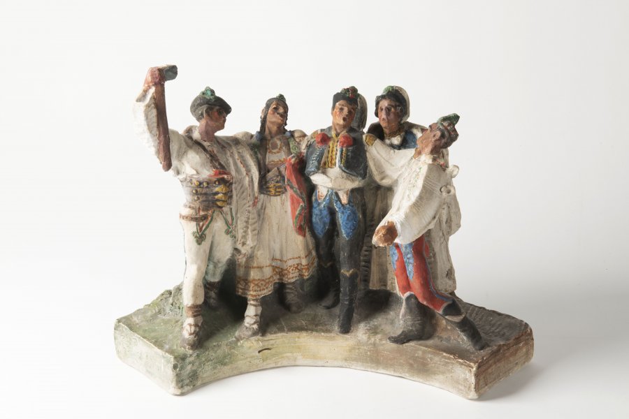 A sculpture of five boys in folk costume. Polychrome plaster. 1920s-1930s. The author is František Úprka. Unsigned.