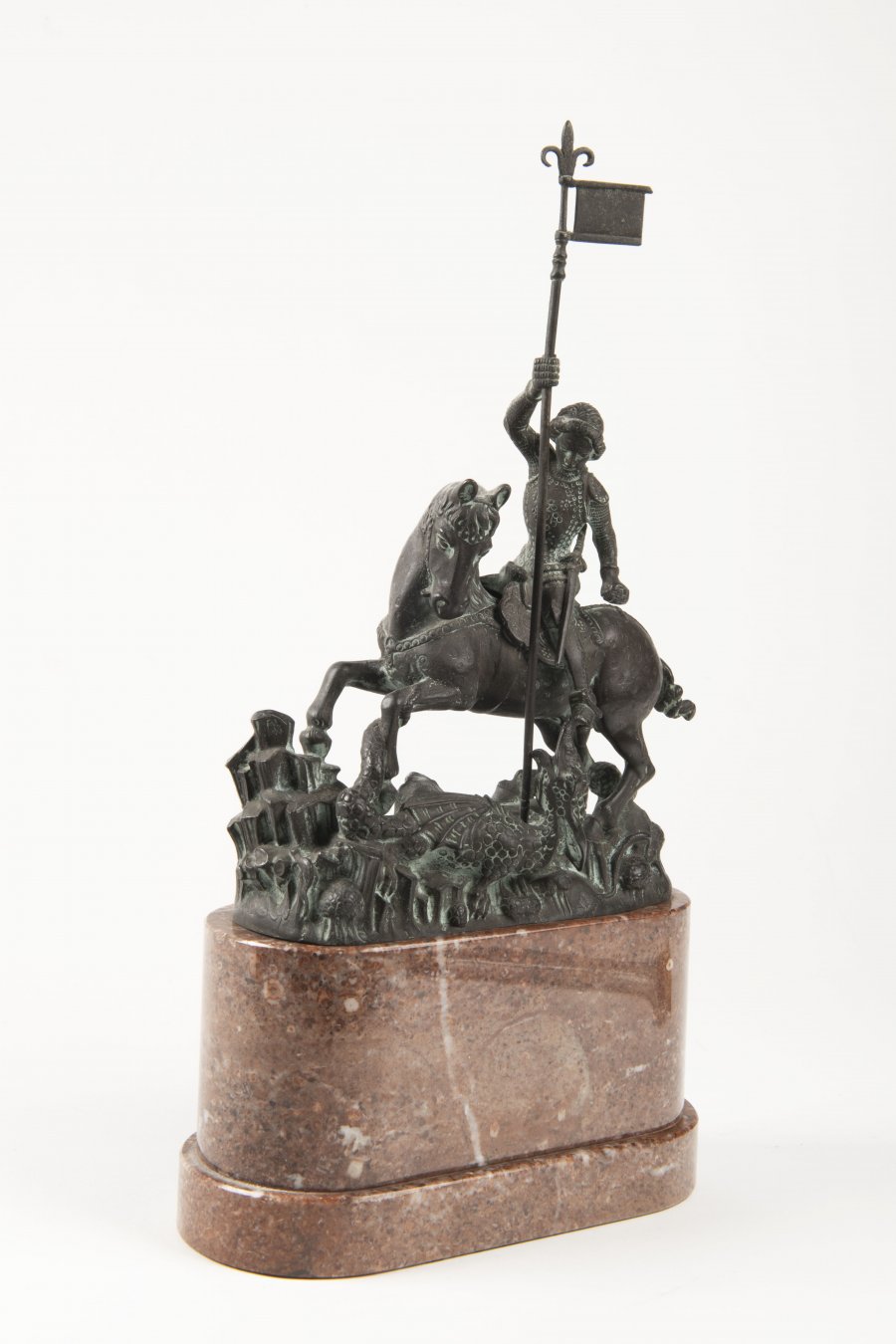Bronze sculpture of St. George used as an honour award (see inscription on marble base). Cast from the workshop of František Anýž, based on the Gothic bronze statue of Martin and George of Cluj, located at Prague Castle. Height 29 cm including the base and flag.