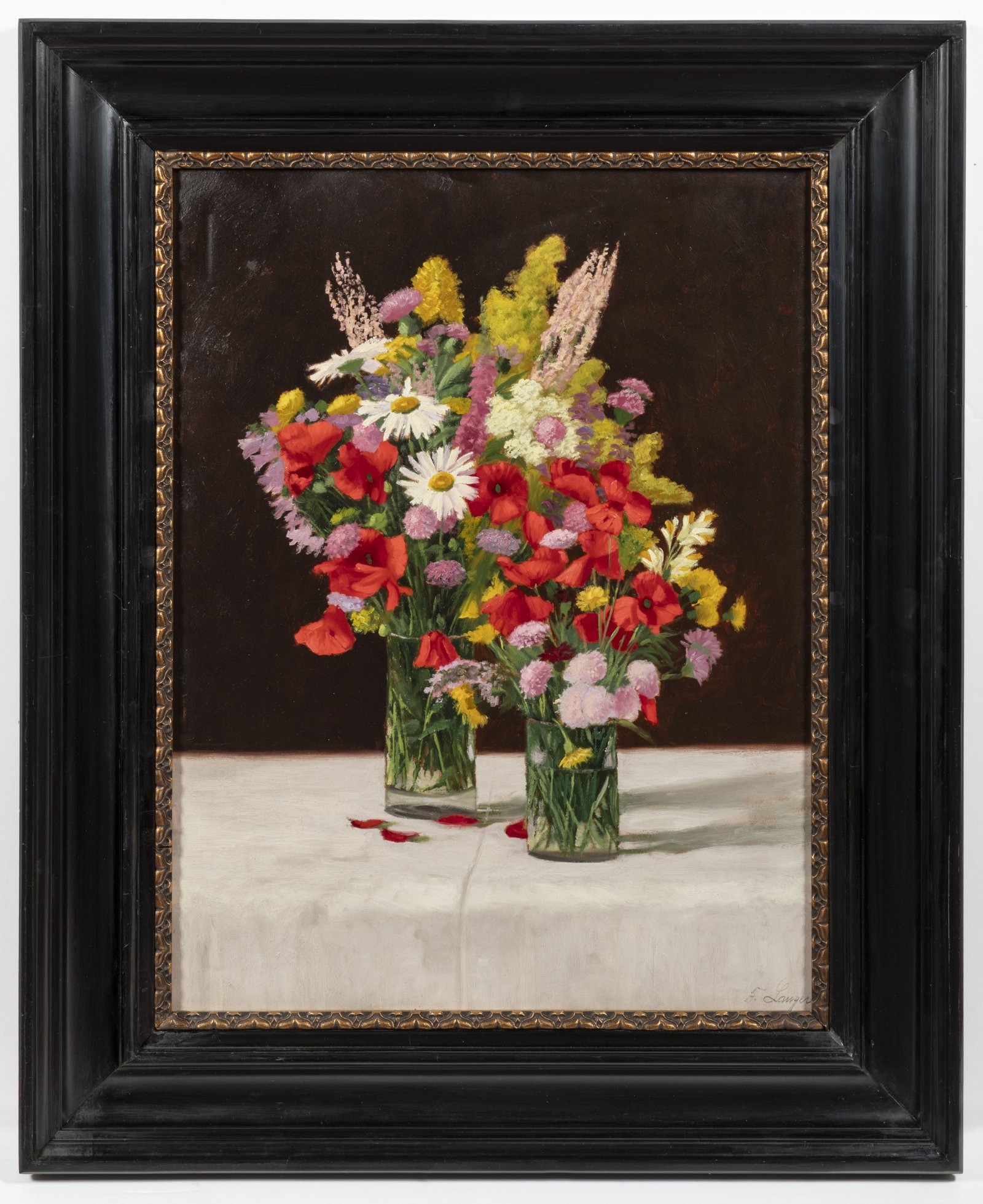Still life with a pair of vases overflowing with colors and summer flowers by the now forgotten artist F. Langer.