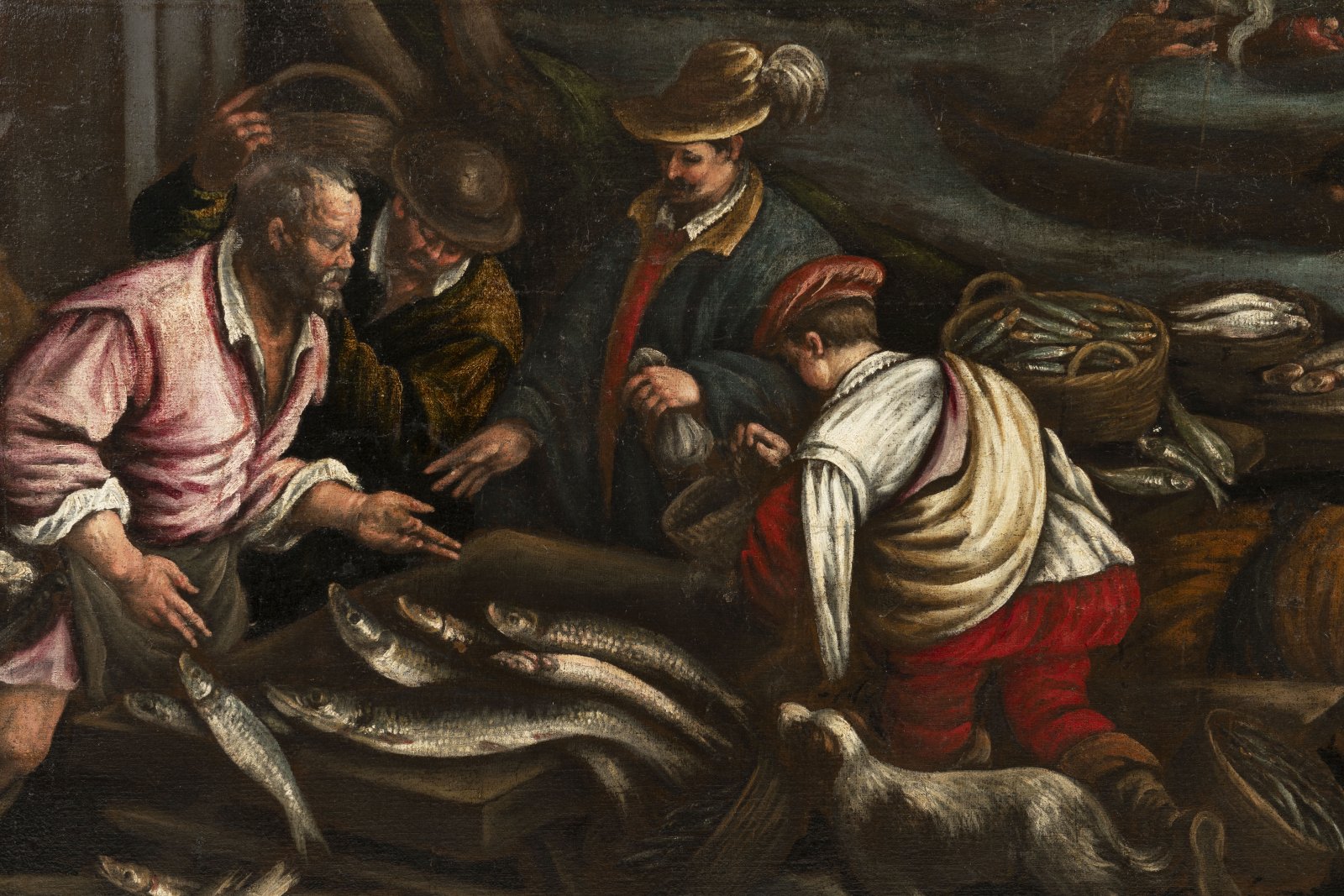 This allegory of water, inspired by the work of Jacopo and Francesco Bassano, depicts a nocturnal scene at a fish market located on the banks of a river. Vendors offer a variety of fish, while the surrounding figures shop or engage in other water-related activities, and boats sail on the river.