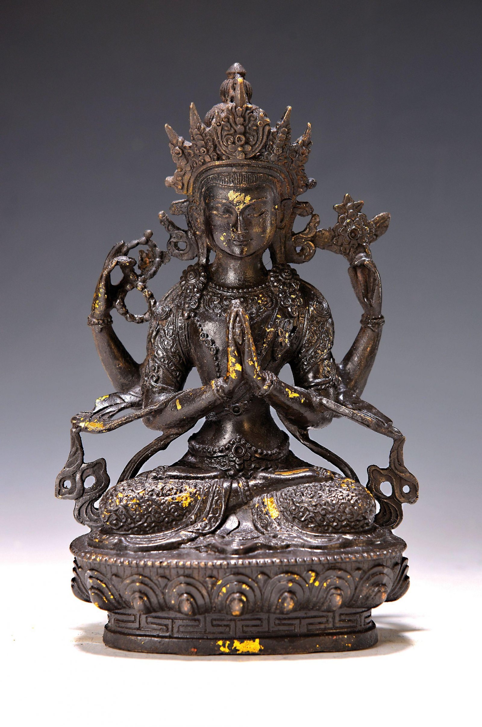 Cast dark patinated bronze four-armed bodhisattva of compassion, finely gilded in places. The bronze, made using the lost wax method, is covered on the bottom with a copper alloy plate.