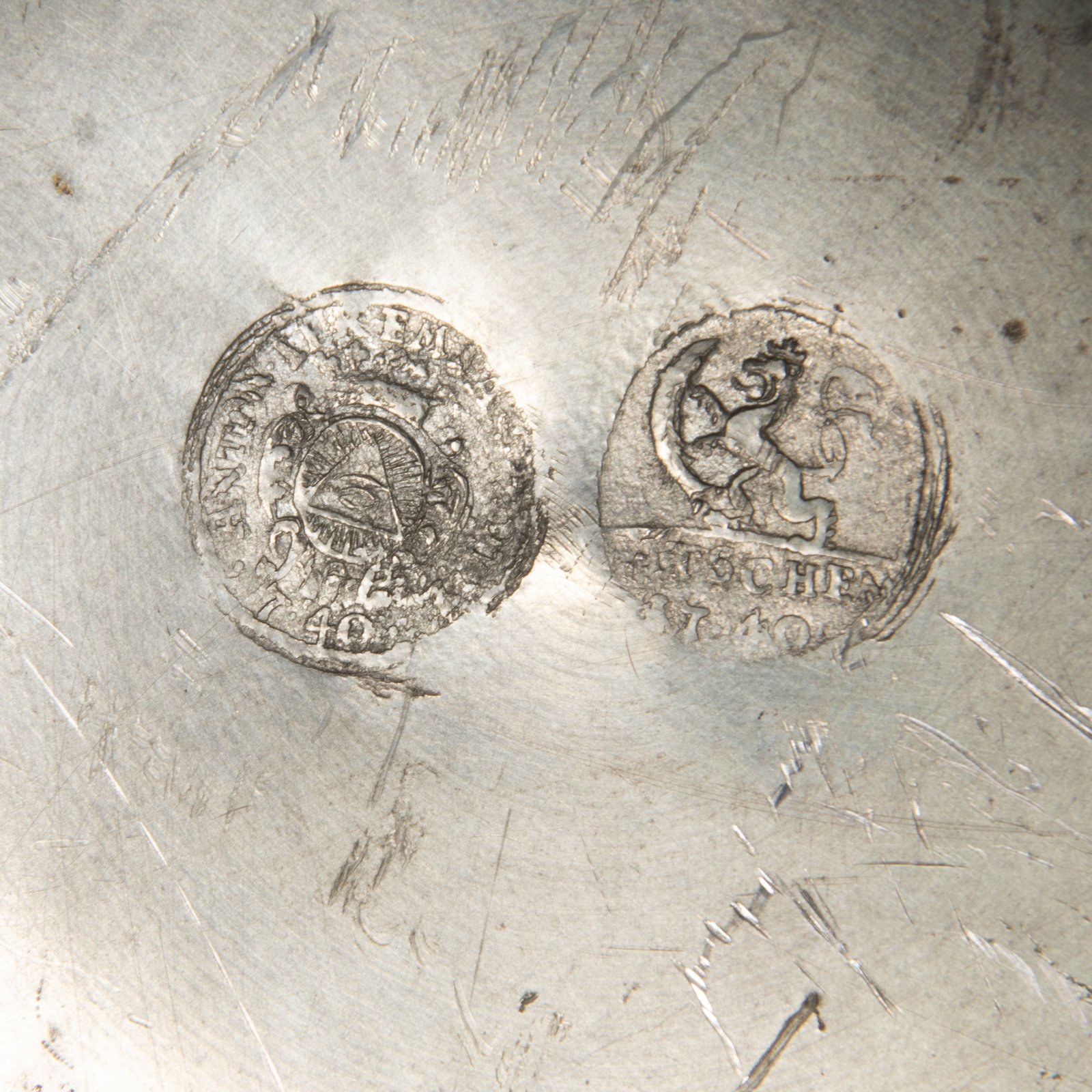 A tin commemorative plate with an engraved figural scene of a woman with a child, complemented by rich floral decoration and two cherubs carrying a ribbon with a dedication. Around the circumference is an engraved inscription with the date 1778, suggesting a gift or family heirloom from the Central European environment of the Clasicist period.