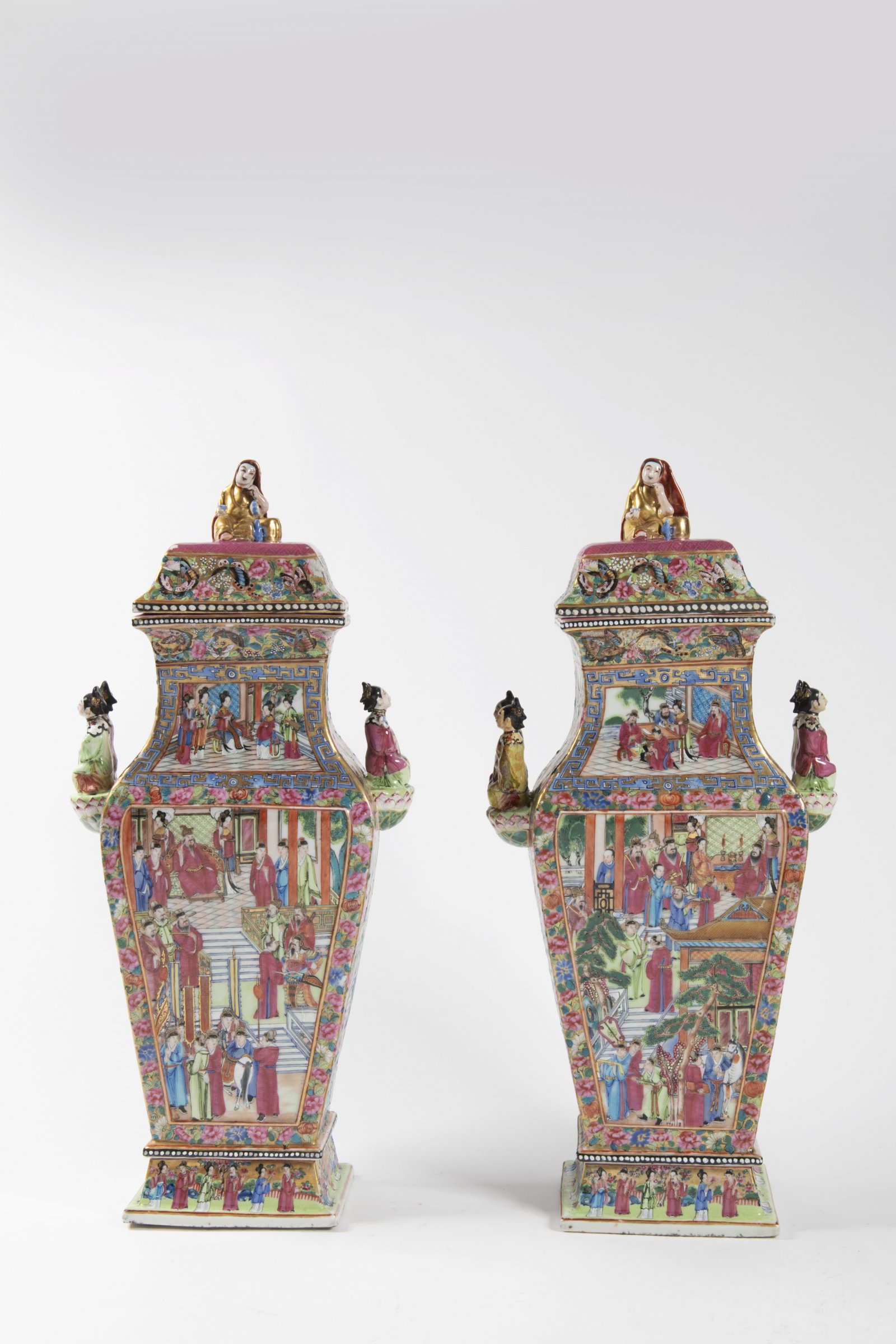 China, circa 1850, Qing dynasty. A pair of rare porcelain vases in Famille Rose colors with old, exceptionally high-quality enamel and gilded decoration in the Mandarin Rose style. The figural handles in the form of elegant court ladies with fans are a remarkable and rare feature of this investment porcelain, but even rarer are the decorative figures on the lids of both vases, symbolizing the Buddhist goddess of mercy Kuan Yin with a cup of sacred nectar. The goddess sits on a pink lotus latticework, which embodies her lotus throne, and interestingly complements the numerous scenes of a secular nature, which subtly show the opulent life of the imperial court. Apocryphal marks on the bottom of both vases.