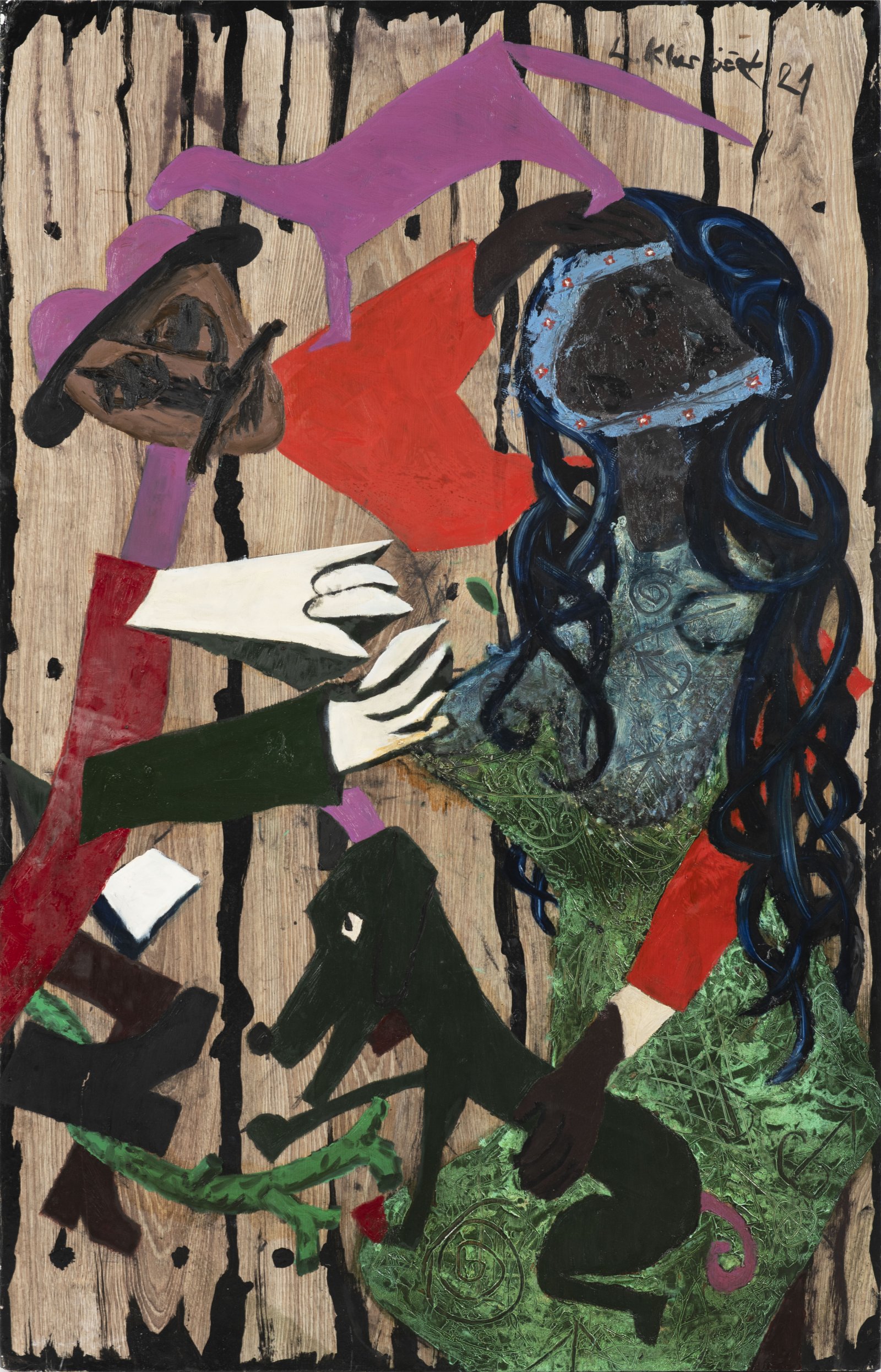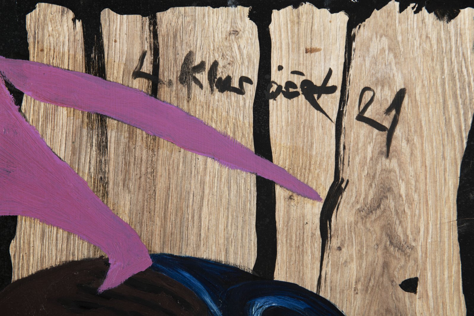 Ladislav Klusáček is represented, for example, in the collections of the National Gallery in Prague, the Central Bohemian Gallery, and private collections at home and abroad. He is known for his monumental paintings of public spaces, such as the Prague Intercontinental. His playfulness of subject matter and ingenious interplay of bright colours and strong contrasts are often highlighted. The centre of his motifs are people, society and animals, often in slightly comic situations. Plywood slightly bent.