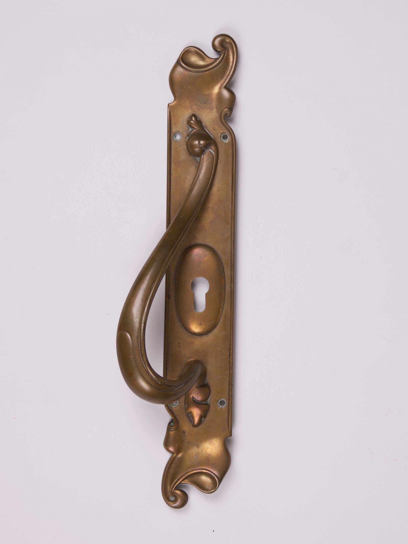 Elegant massive gate handle with decorative volutes in the style of art nouveau.
