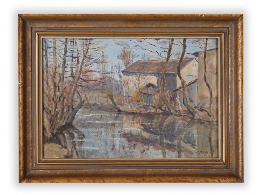 Landscape painting of a river landscape with enclosed houses and a suggestion of reflections on the water surface.