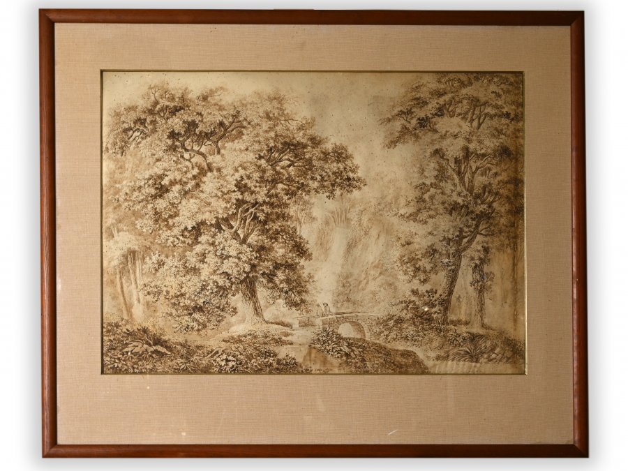 Drawing of a deep forest with a bridge over the river with human staffage.