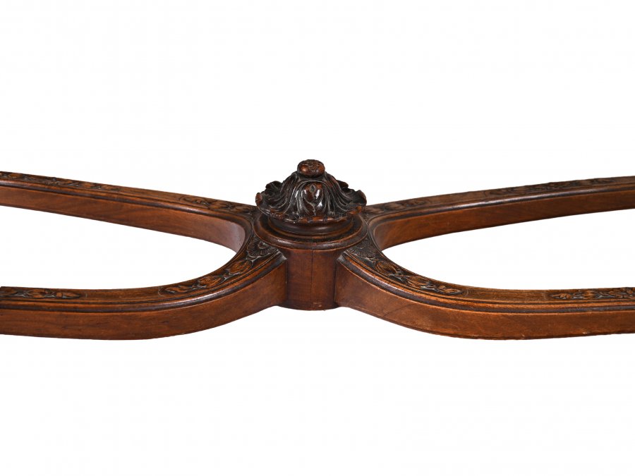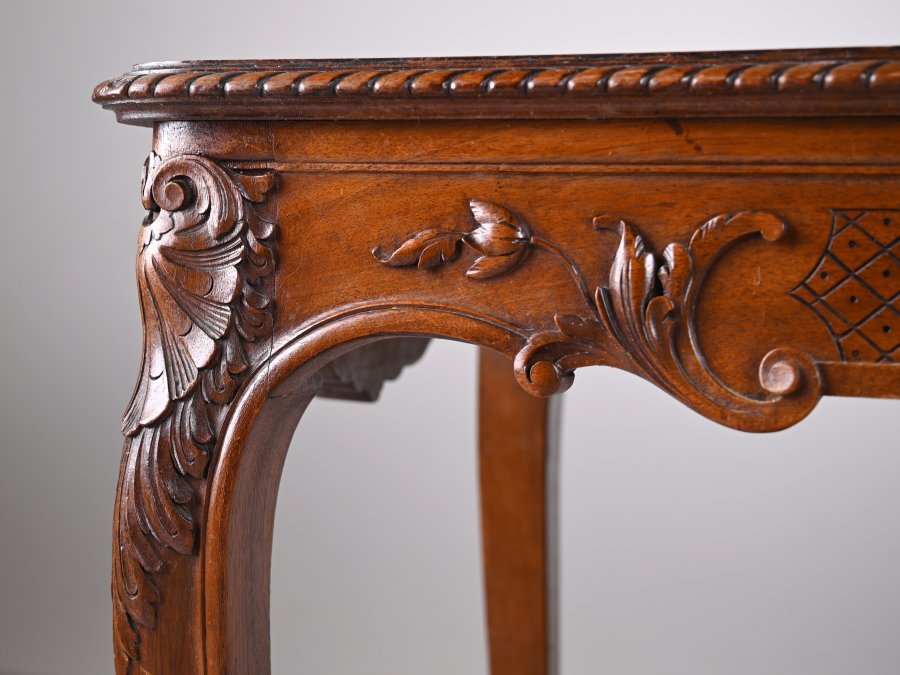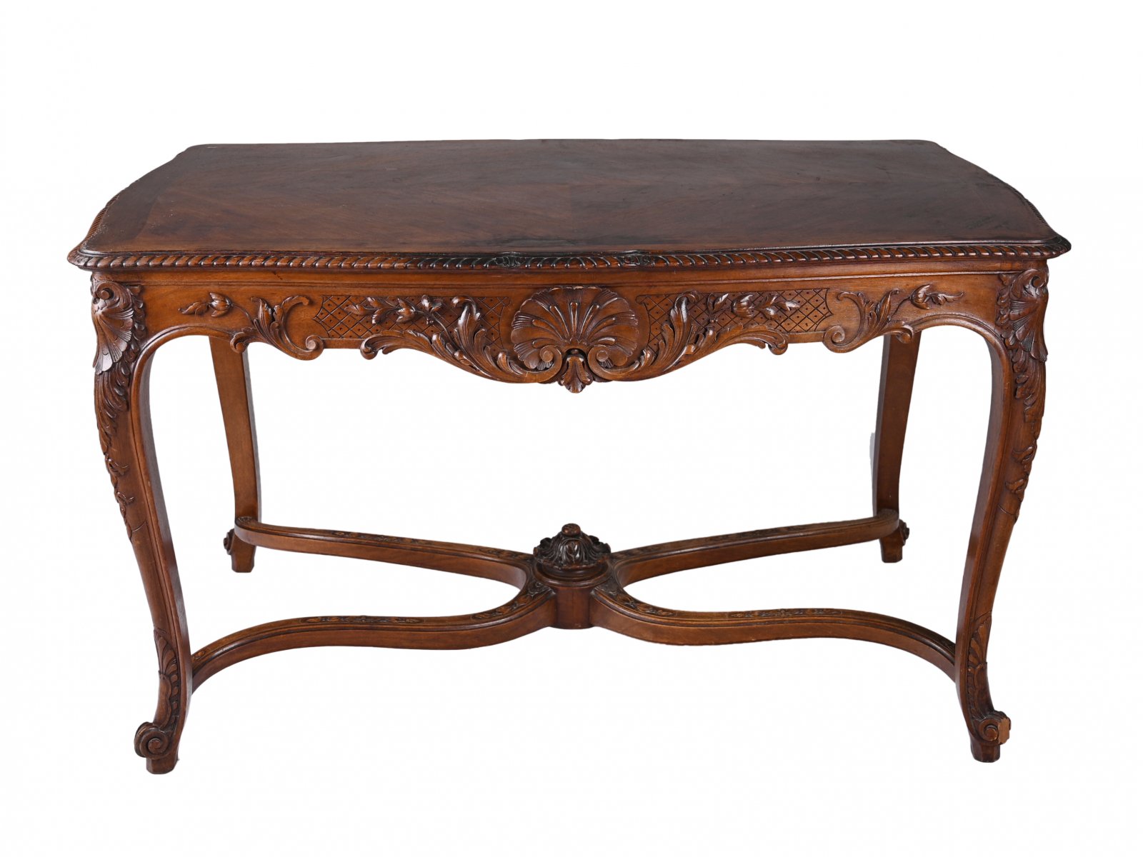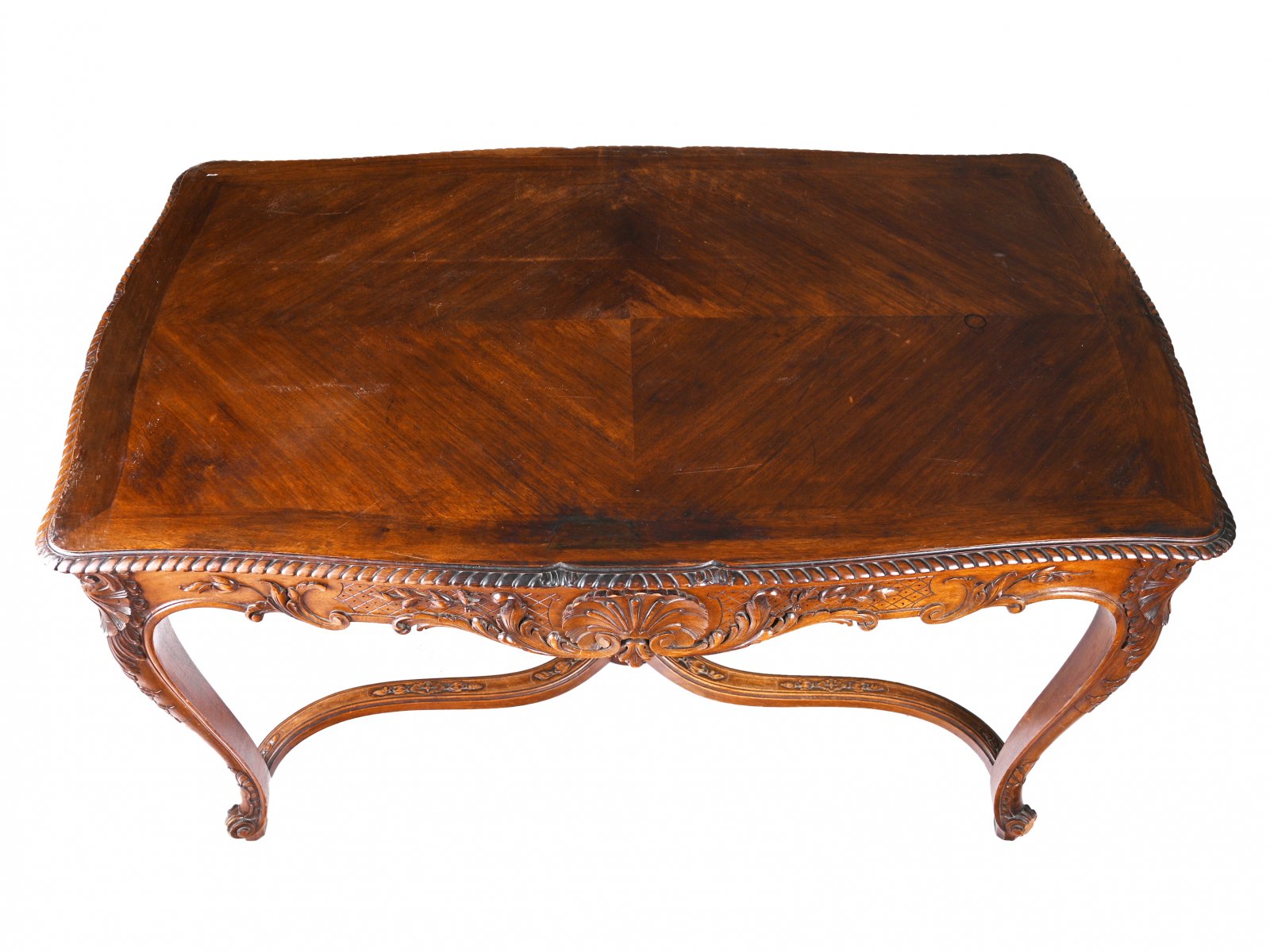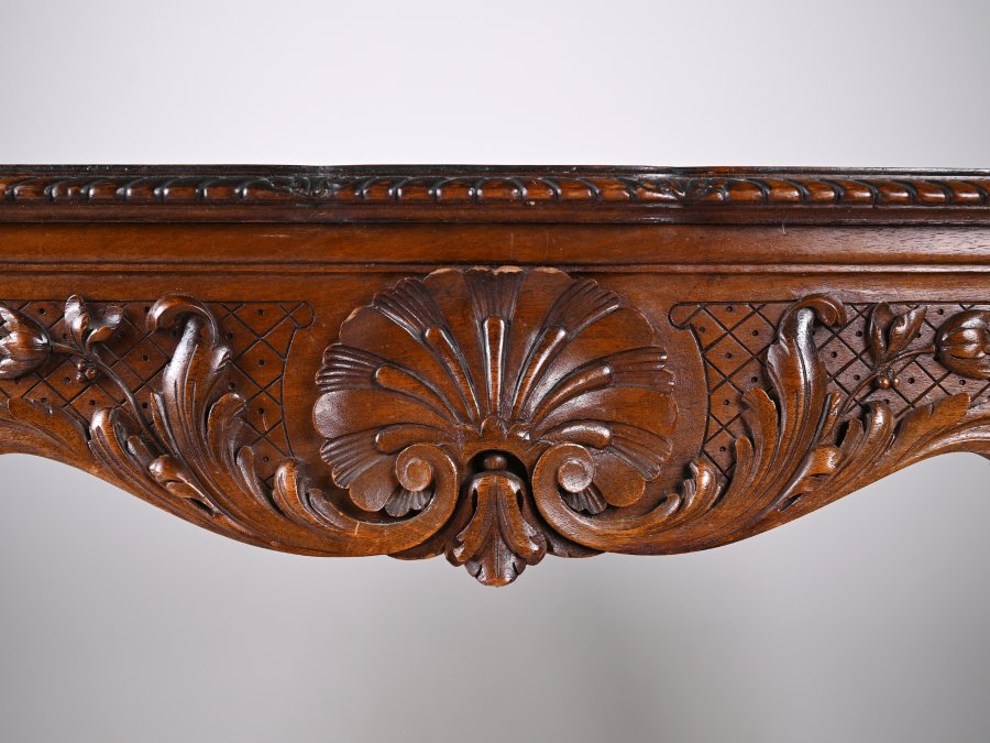 Bohatě zdobený novobarokní stůl s rostlinou a mušlovou řezbou s trnoží s ornamentem. Výborný stav.