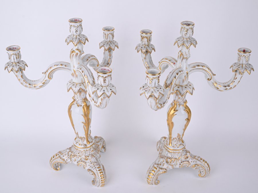 Gilded four-branch porcelain candelabra, convertible, brand: Schierholz Porzellanmanufaktur.