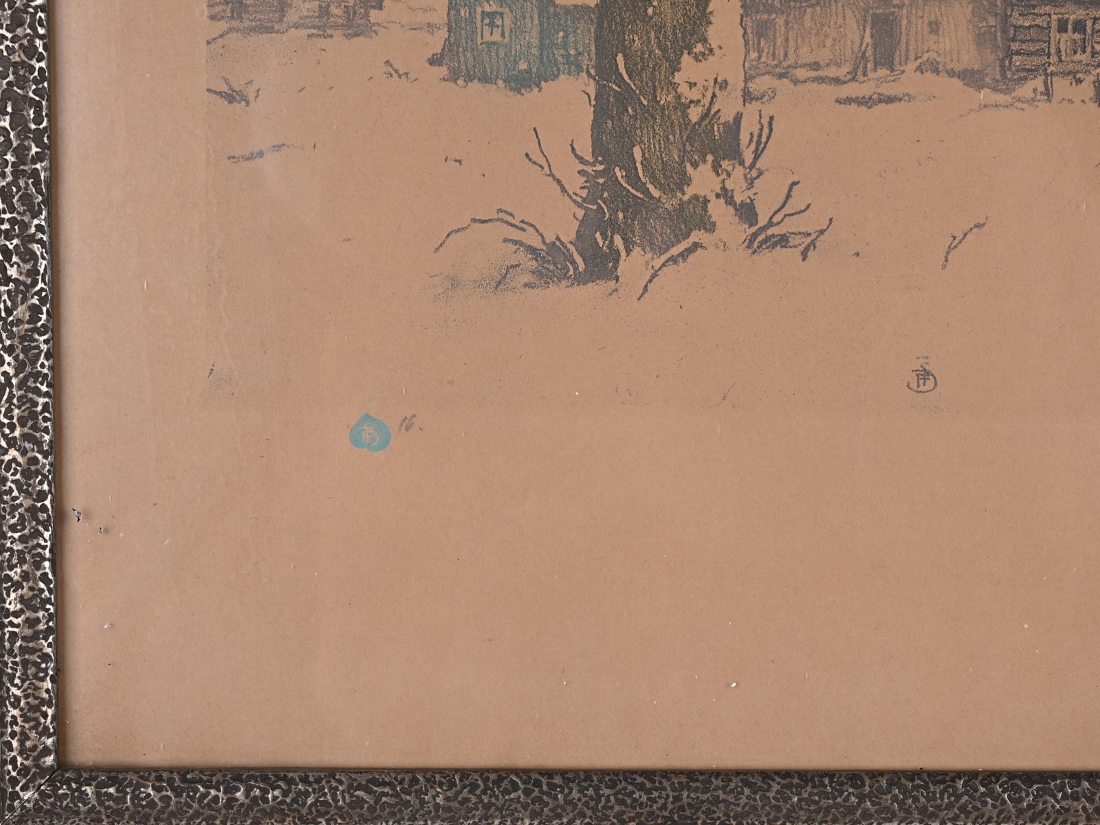 Graphic sheet with timbered snow-covered cottages from the extensive production of František Šimon Tavík. František Šimon Tavík was one of Max Pirner's pupils and was one of the most important graphic artists, painters, woodcutters and later taught at the Academy of Fine Arts. He was a member of SVU Mánes and a co-founder of the Hollar Association. He traveled extensively - in the years 1926 - 1927 he even traveled around the world.