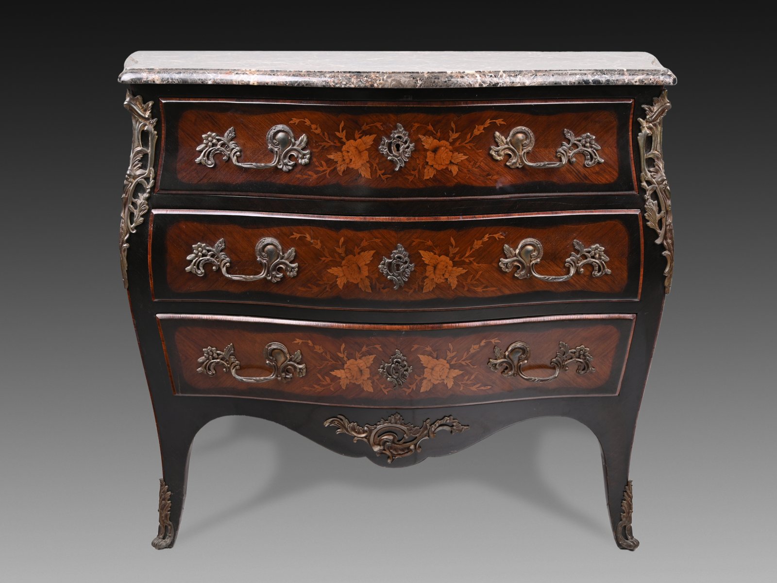 Bohatě intarzovaná francouzská komoda s masivními madly a rokokovým kováním, které tematicky ladí k motivu florální intarzie. Na vrchu šedý mramor s bílým žilkováním. Výborný stav.