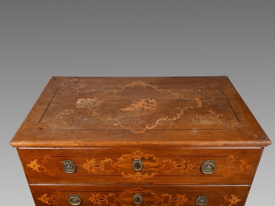 Bohatě zdobena rokoková komoda intarzovaná jak po bocích figurálními motivy, tak na vrchní desce i na čelních šuplících převážně rokajemi. Komoda dobově spadá na pomezí mezi doznívajícím stylem rokoka a počínajícím klasicismem, o kterém svědčí kvalitně zpracované kování a madla znázorňující vázu a vavřínový list jako úchytku. Dobrý stav bez větších známek poškození, určená k menšímu restaurování.