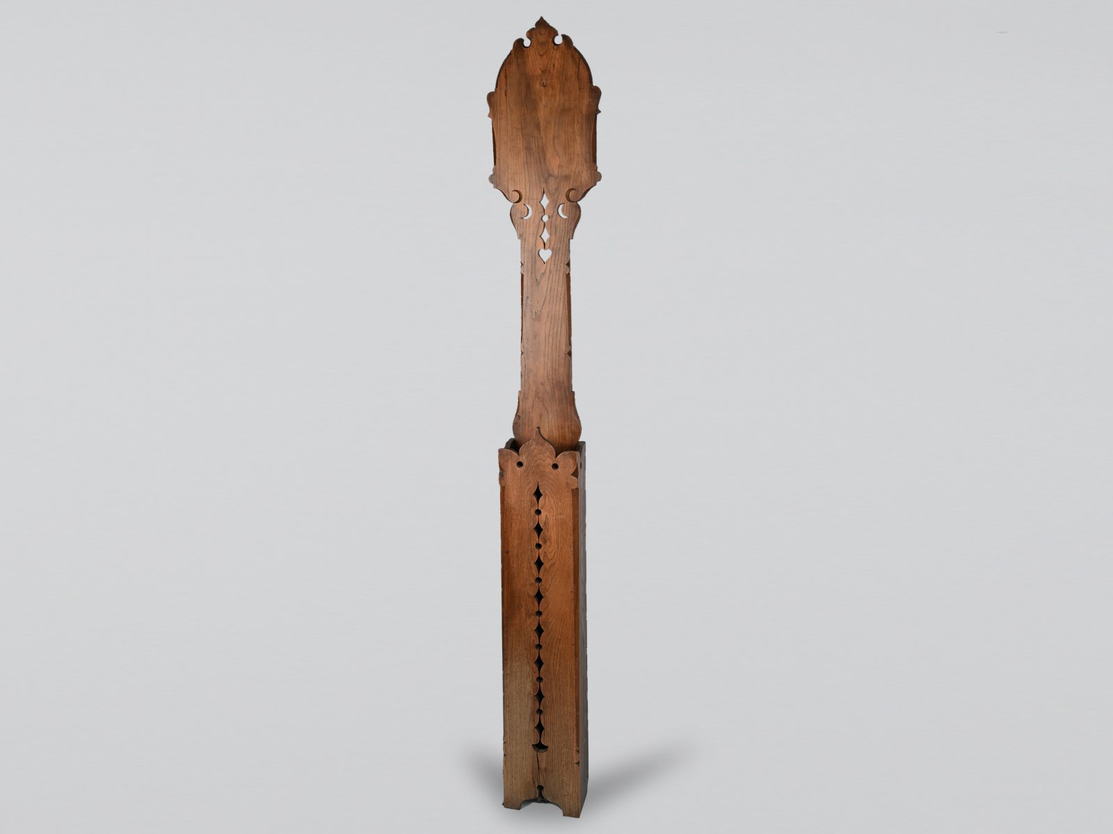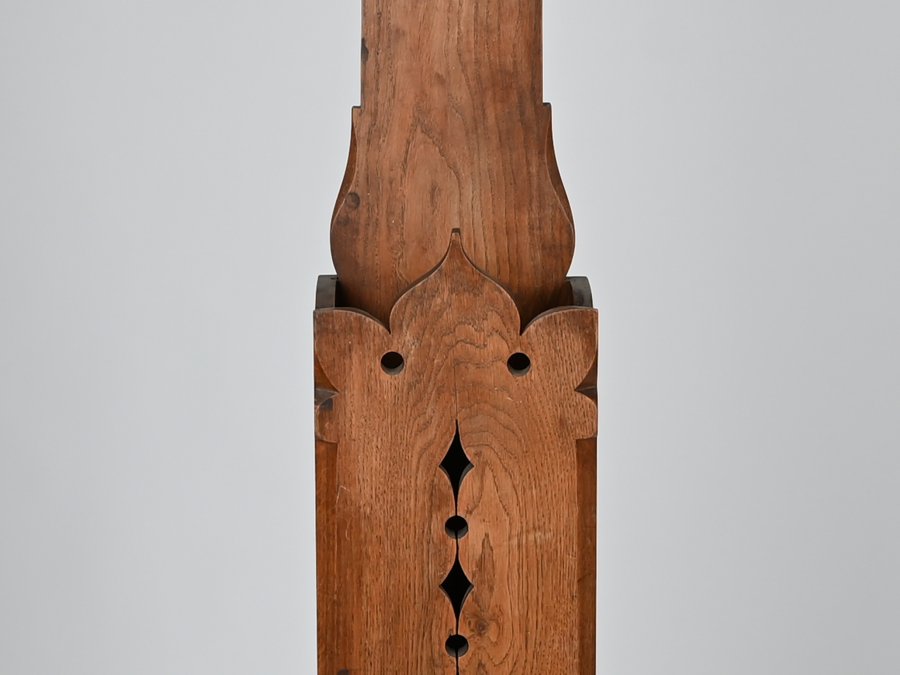 The four-part bedroom, consisting of a bed, bedside table, dressing table and clock holder, was designed in 1899 for the girls' boarding house Vesna in Brno. It was realized in 1900-1902. The main motif that connects all three pieces of furniture is the stylized motif of an open dove's tail, based on folk architecture. On the bed it forms the headboard and on the tables it is part of the supporting structure and supports the top. The furniture is also decorated with carved floral motifs inspired by folk painting and embroidery. It is the mixing of folk and Art Nouveau elements that makes Jurkovič's work unique and extraordinary. Dimensions: bedside table 75 x 47 x 45 cm; dressing table 71 x 109 x 66,5 cm; bed 116 x 96 x 203 cm; holder 227 x 33 x 15 cm.