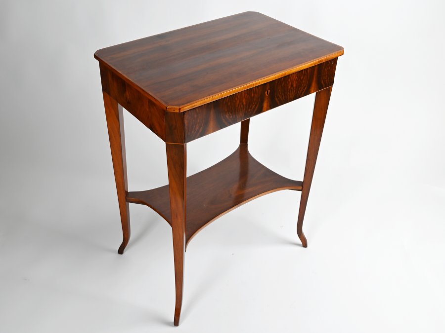 The elegant Biedermeier side table is made up of one hidden drawer with inlay around the lock. The four legs are held by a rounded trunk. The top with a rich wood grain lined with maple. Completely restored. Excellent condition.