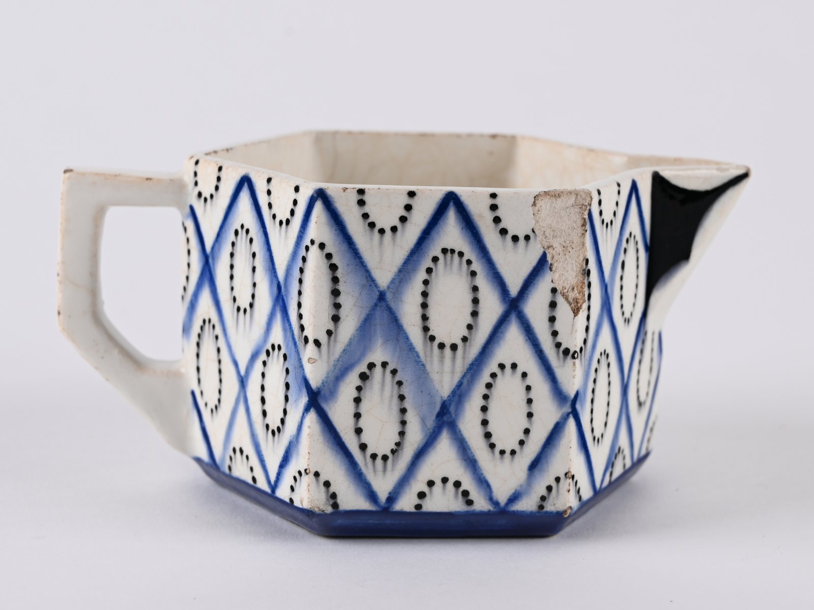 Hexagonal shape, cream glaze, black and blue geometric decor, designed by Rudolf Stockar 1918 for Artěl, made by Graniton, Rydl and Thon.