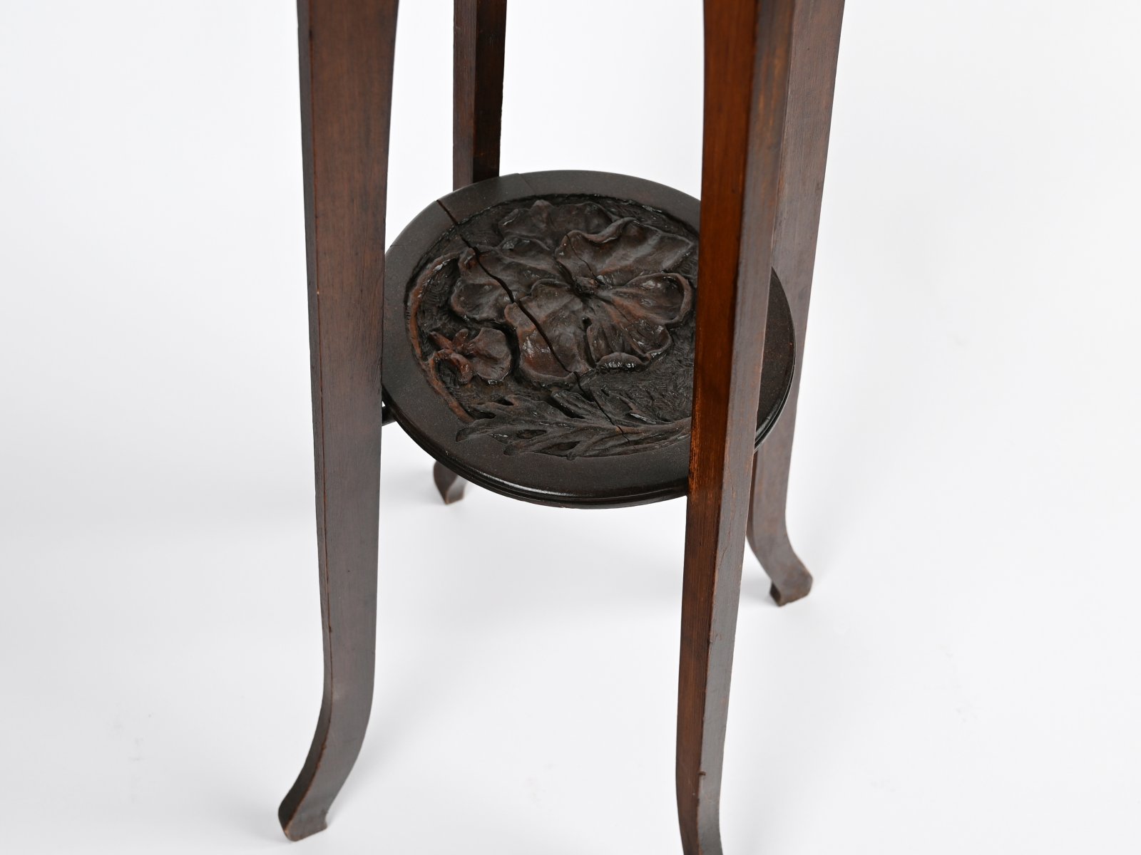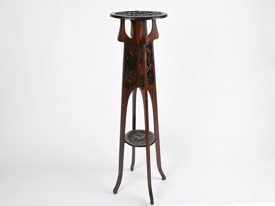Richly decorated column from the early organic art nouveau period with floral motifs in polychrome coloured wood. Sculptured round top plate with spines. Completely restored. Excellent condition.