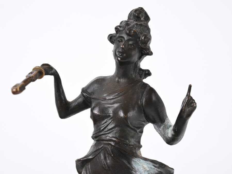 Patinated metal, wooden stained base, clock movement connected with a pendulum placed on the hand. Enamel dial, probably Junghans mark, the movement is not running.