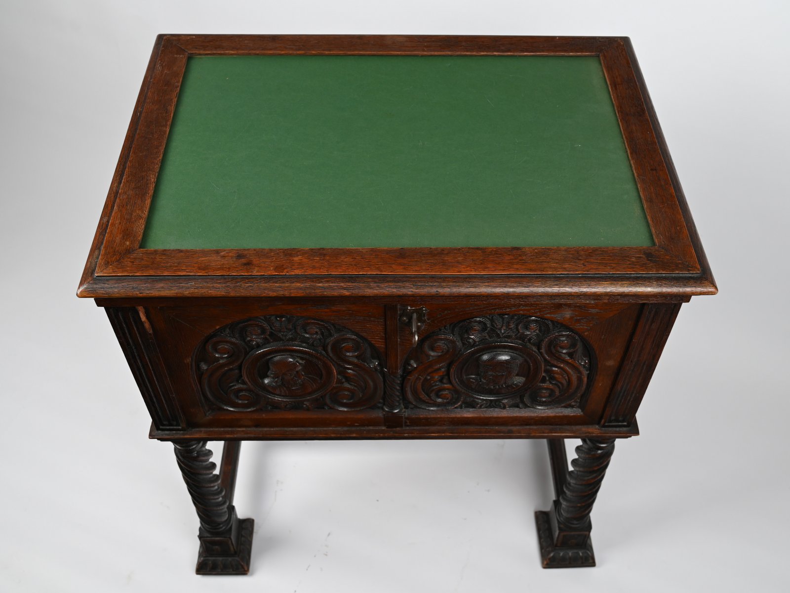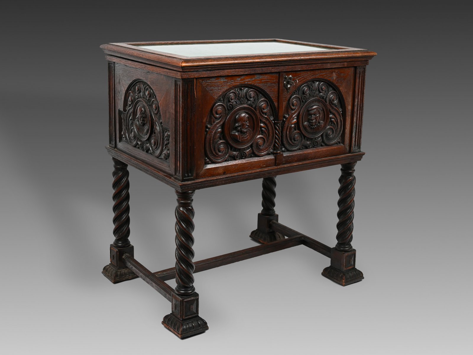 A richly carved chest on four torded legs. Key, glass plate on top. Excellent condition.
