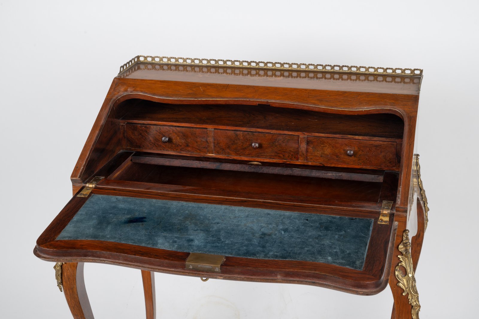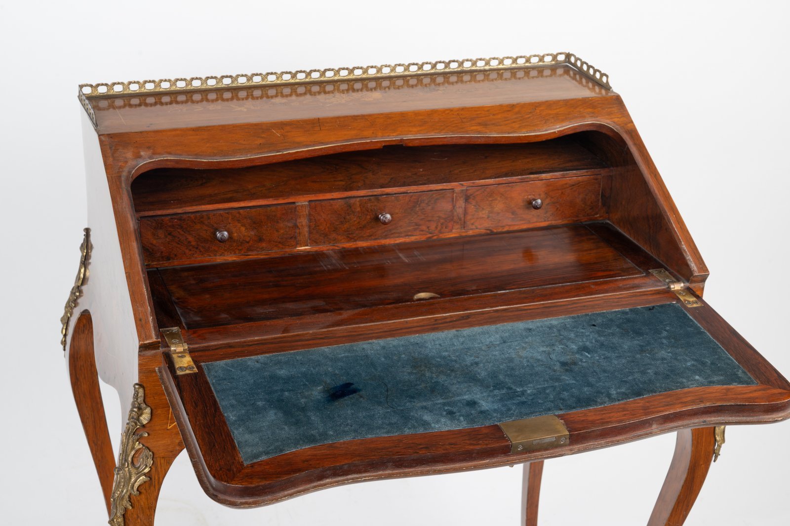The elegant richly inlaid bureau from the reign of Napoleon III in France is decorated with floral motifs. Gilt bronze on the sides, three drawers and one hidden storage compartment inside the lockable hinged top. Good condition.