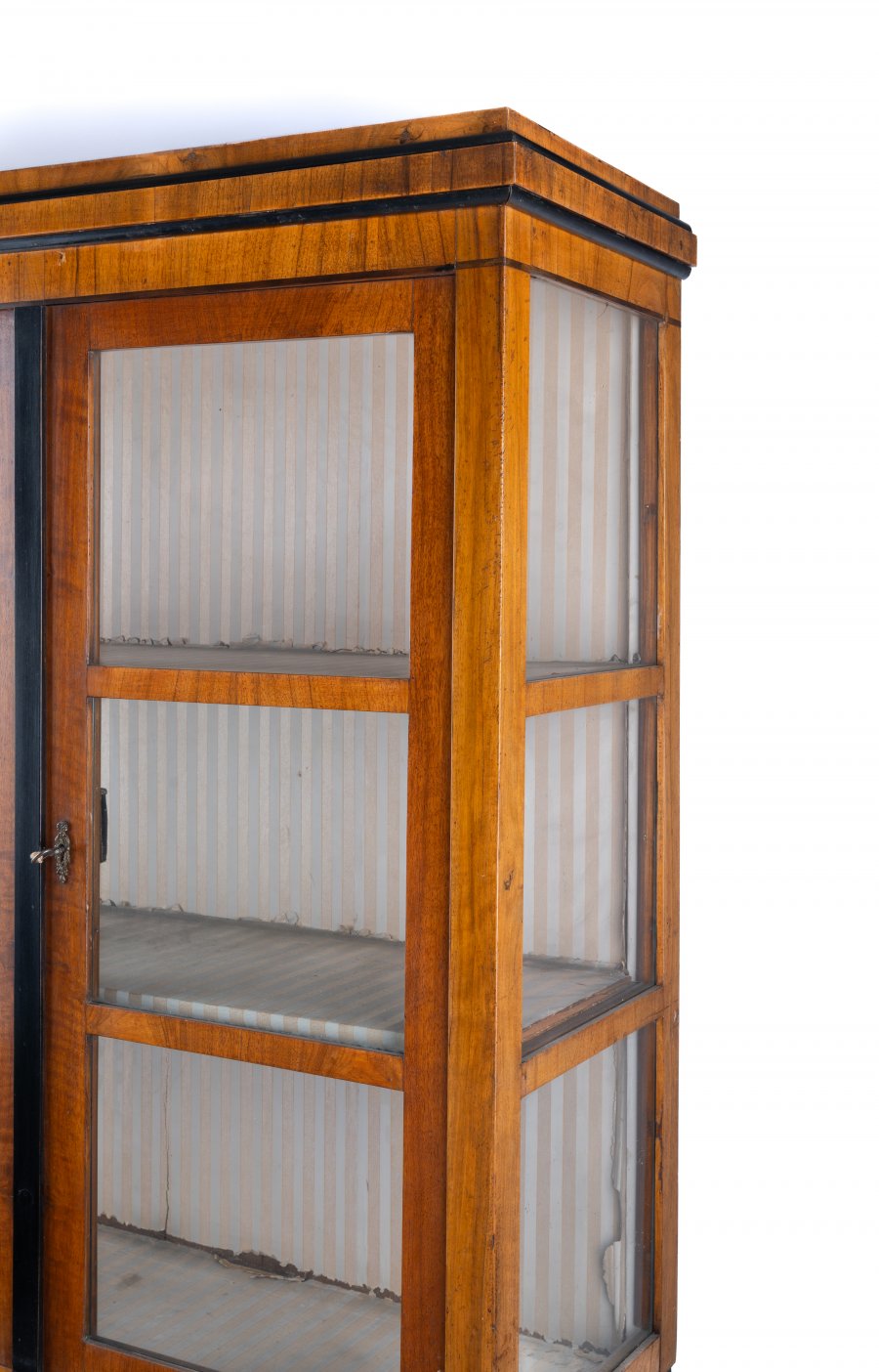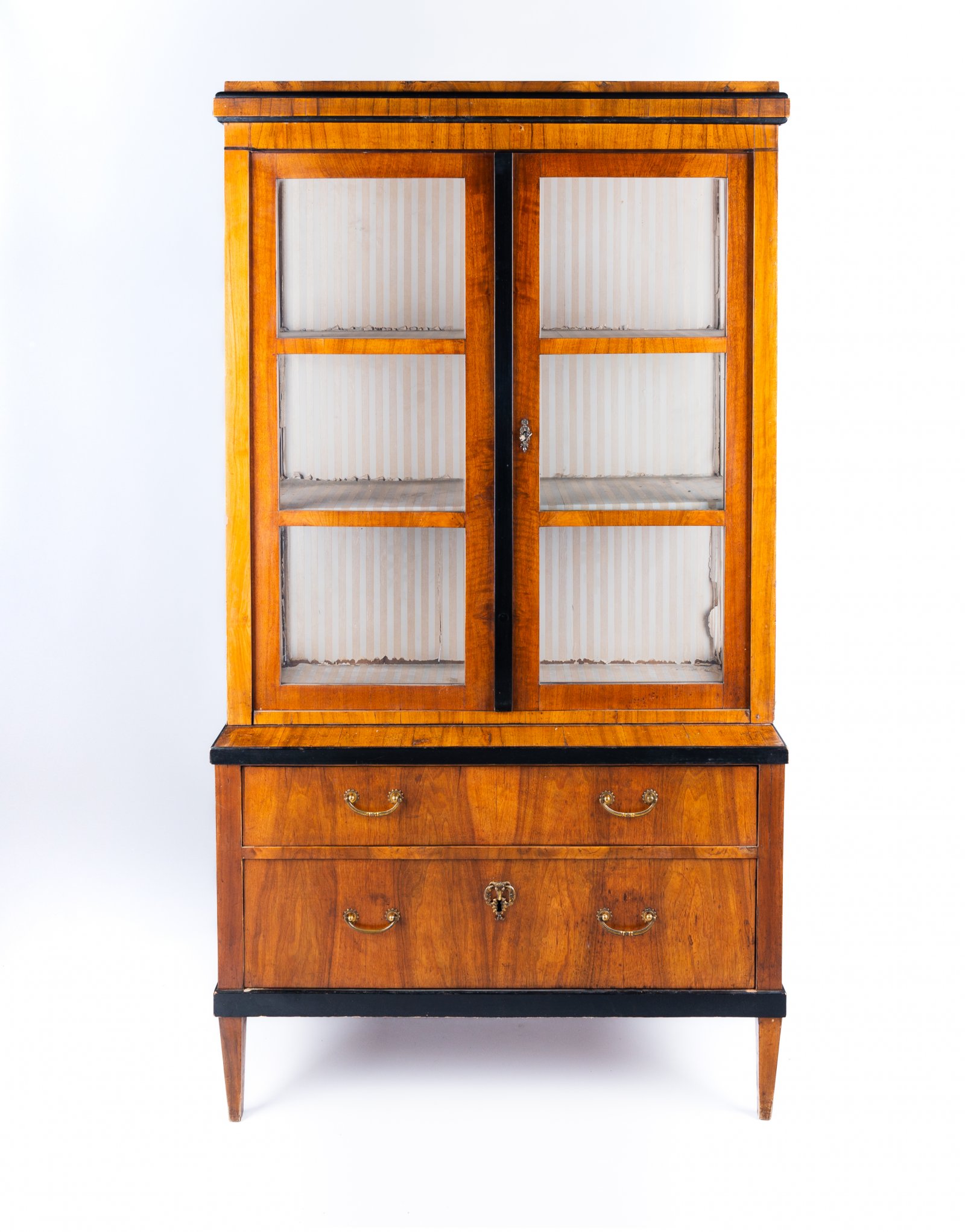 Elegant display cabinet from the Biedermeier period with original glass and storage space as a separate chest of drawers with gilt bronze fittings with ram's head. The walnut pattern is complemented by lines of blackened pear. Good condition.