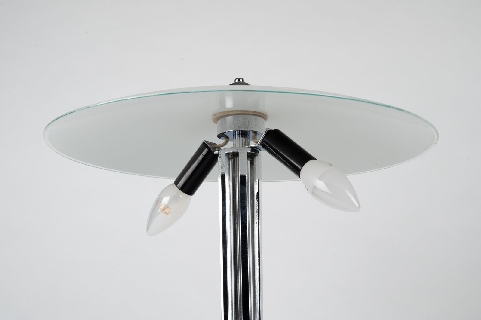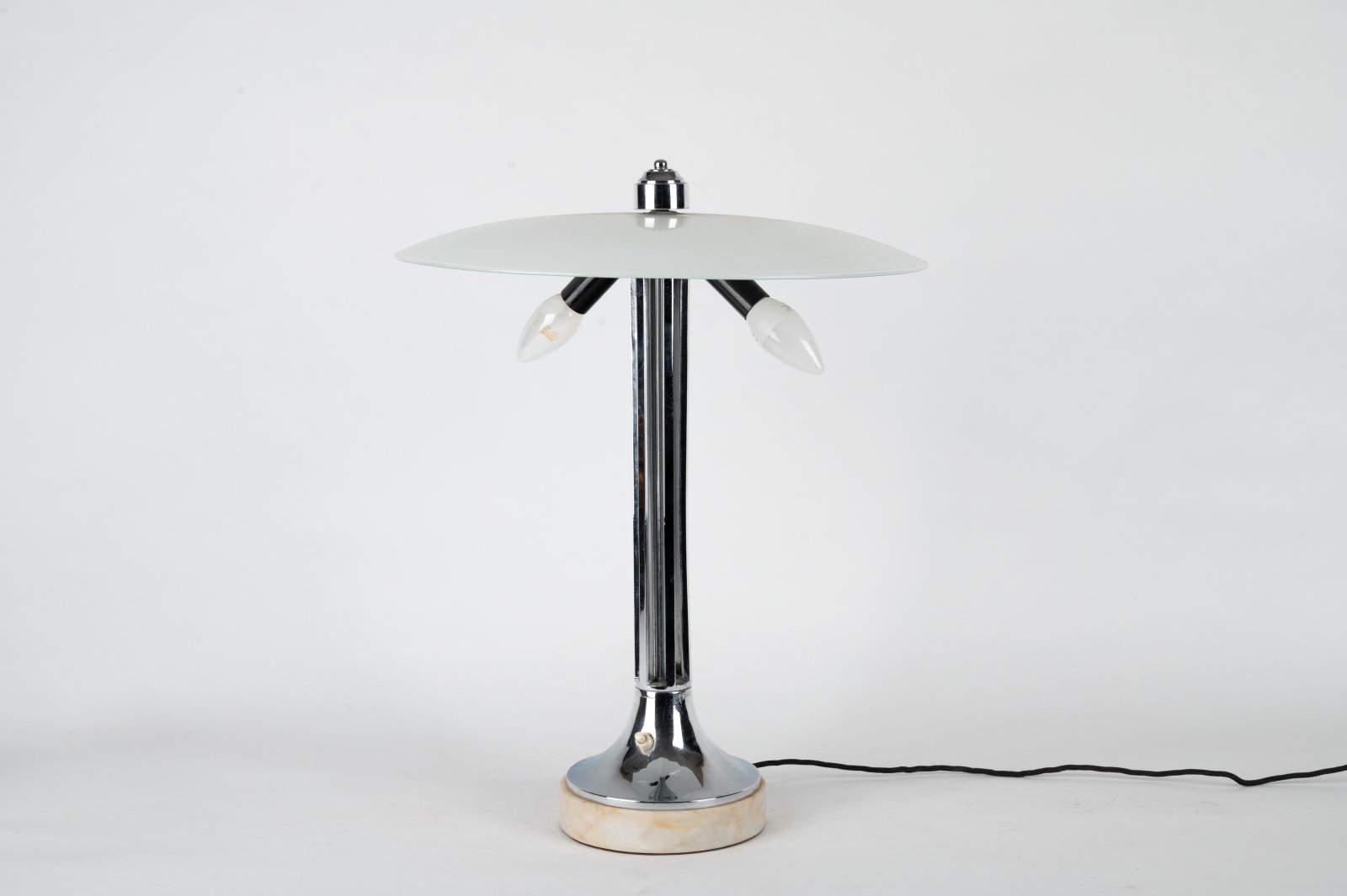 A lamp according to the models of the functionalism period with a glass shim and a chrome leg on a marble base. Electrified