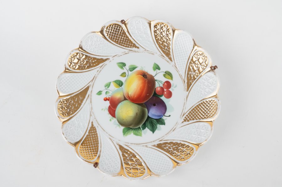 Meissen plate with summer fruits and gilded peripheral embossed decoration evoking a basket or an envelope.