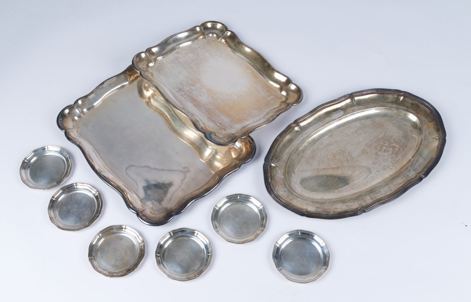 A set of three large trays and six smaller trays with a total weight of 3.4 kg. Punched.