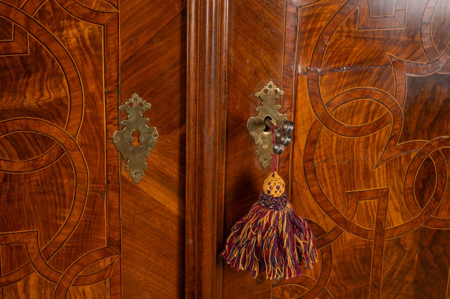 A large baroque cabinet with walnut geometric inlay on richly figured wood complemented by brass fittings. Excellent condition.