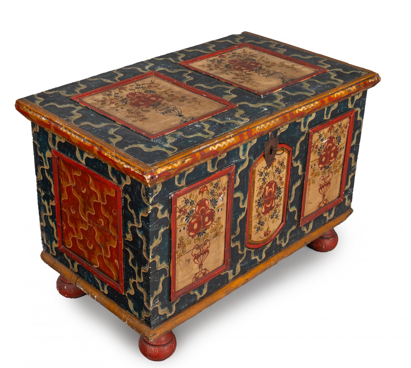 The painted folk chest is made up of a base with imitation marble and floral decoration in framed fields on all the sides of the chest. Very good state of preservation.