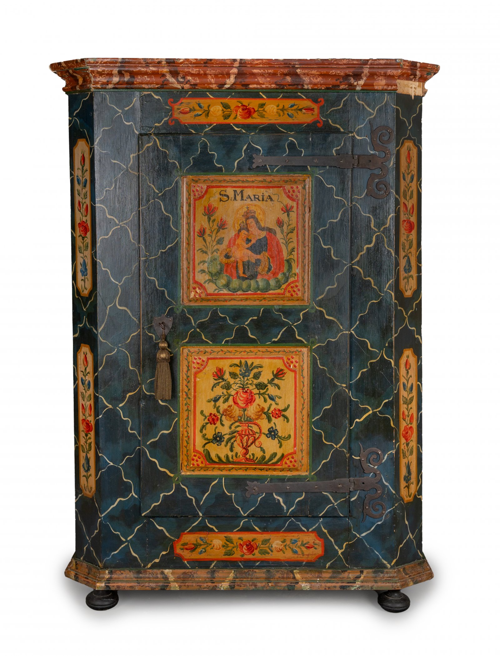 The painted folk cabinet with the theme of the Marian cult is a combination of a folk pattern on a coloured ground with floral motifs and a depiction of the Madonna and the inscription "S. Maria". Good state of preservation, minor defects.