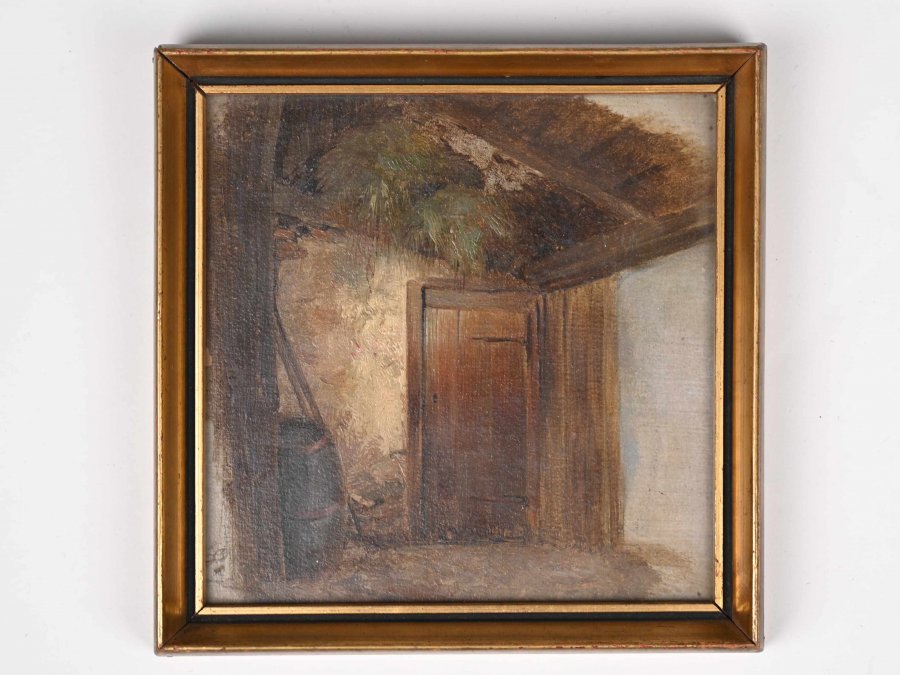 Painting of a smaller format with a motif of a door belonging to outbuilding.