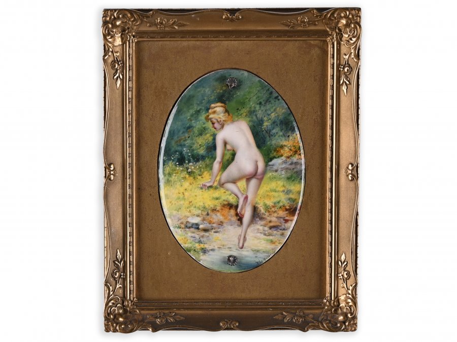Bathing motif by Václav Eduard Haspekl, who focused on paintings on ivory, portrait miniatures and painting on porcelain.