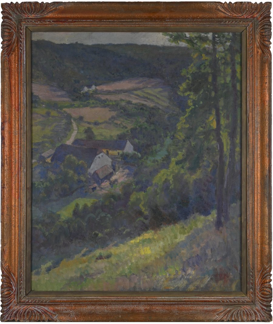 Summer shot from a viewpoint in the woods of farm buildings in the middle of fields. Unknown author, adjusted.