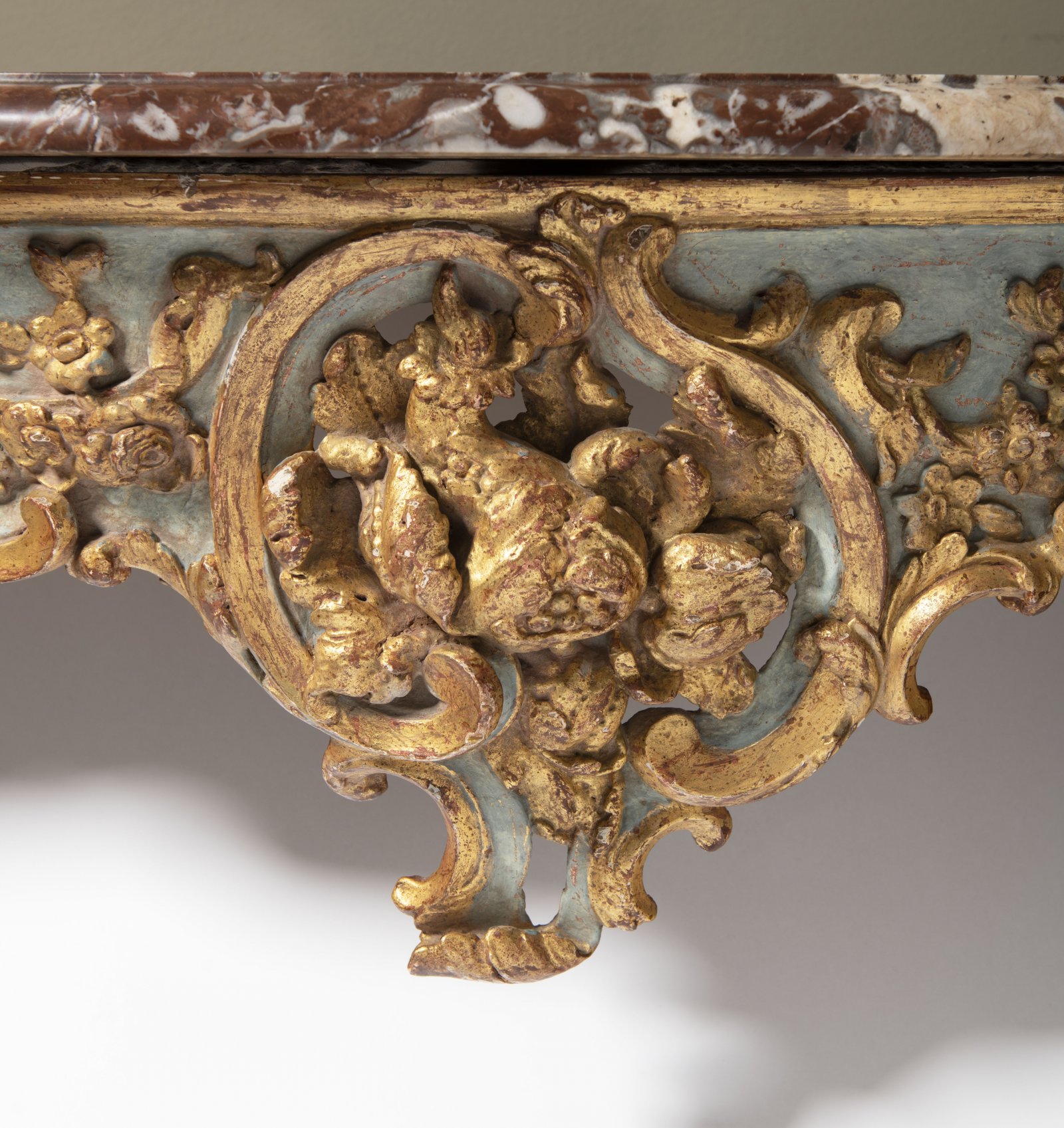The richly decorated rococo console table with its dynamic interplay of cartouches, volutes, and rocailles is an extraordinary work, probably by the furniture makers Johann Schnegg and Johann Schleunig, who furnished the interiors of the Bayreuth court. This work is often characterized by colorful polychrome accentuated floral ornaments with a fanciful, almost irrational morphology. The floral motifs with a dominant central cartouche (buds of opening pomegranates, also known as Krauptköpfe) resemble designs by Johann Michael Hoppenhaupt the Elder, who designed the interiors of residences in Berlin and Potsdam for Frederick the Great. The original marble top is made of a red marble known as 'rance de rouge', which is used, for example, in the interior of the main staircase of the Egmont Palace in Brussels and the Palace of Versailles. Excellent preserved condition. A similar rococo console table can be found in the furnishings of the Neues Schloss in Bayreuth or in the collections of the Metropolitan Museum in New York.