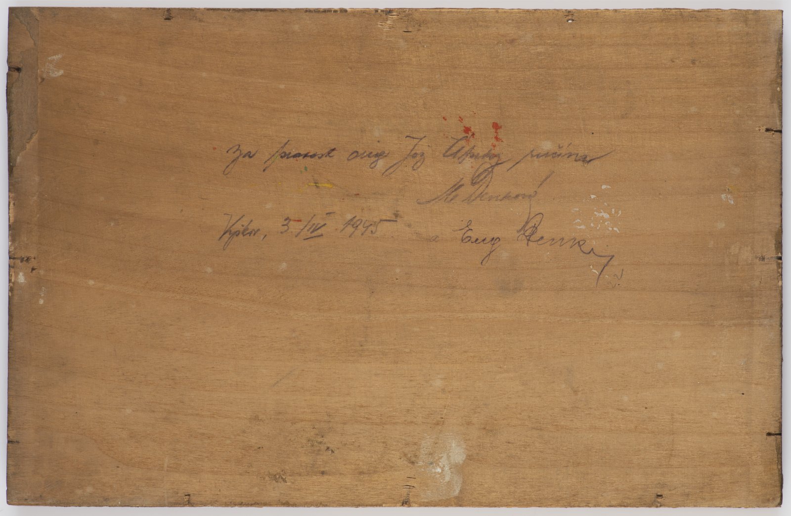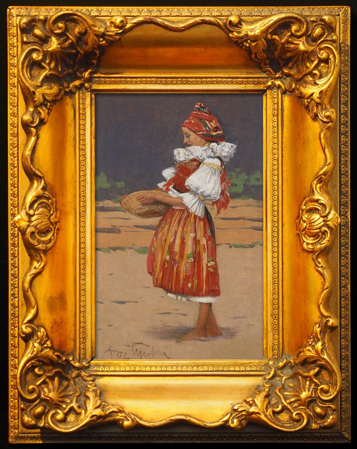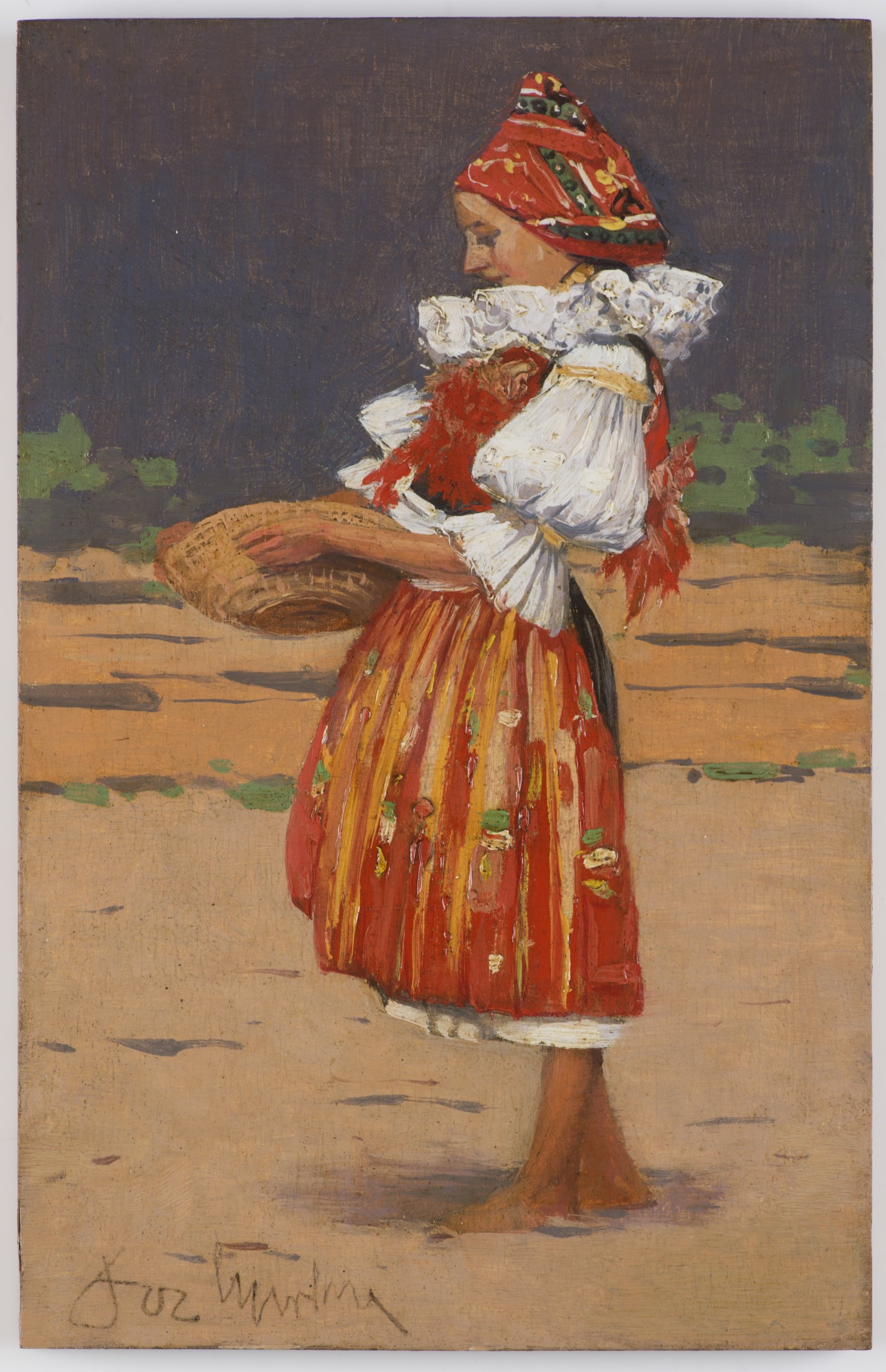 This miniature painting is a typical study of folk costumes from the Slovácko region, which is featured throughout the artist's oeuvre. In part the painting presents period Romantic trends, but primarily it is founded in respect for the artist's hometown and its traditions. He especially latched on to this theme after he returned from France, where he studied modern trends. In a letter to his friend Josef Klvaňa, Úprka admitted he had been deeply influenced by French modernism and added that what he had seen was enough for several years of work. Oil on wood, signed on bottom left "Jož. Úprka"; on the back is an inscription verifying the authenticity of the work.