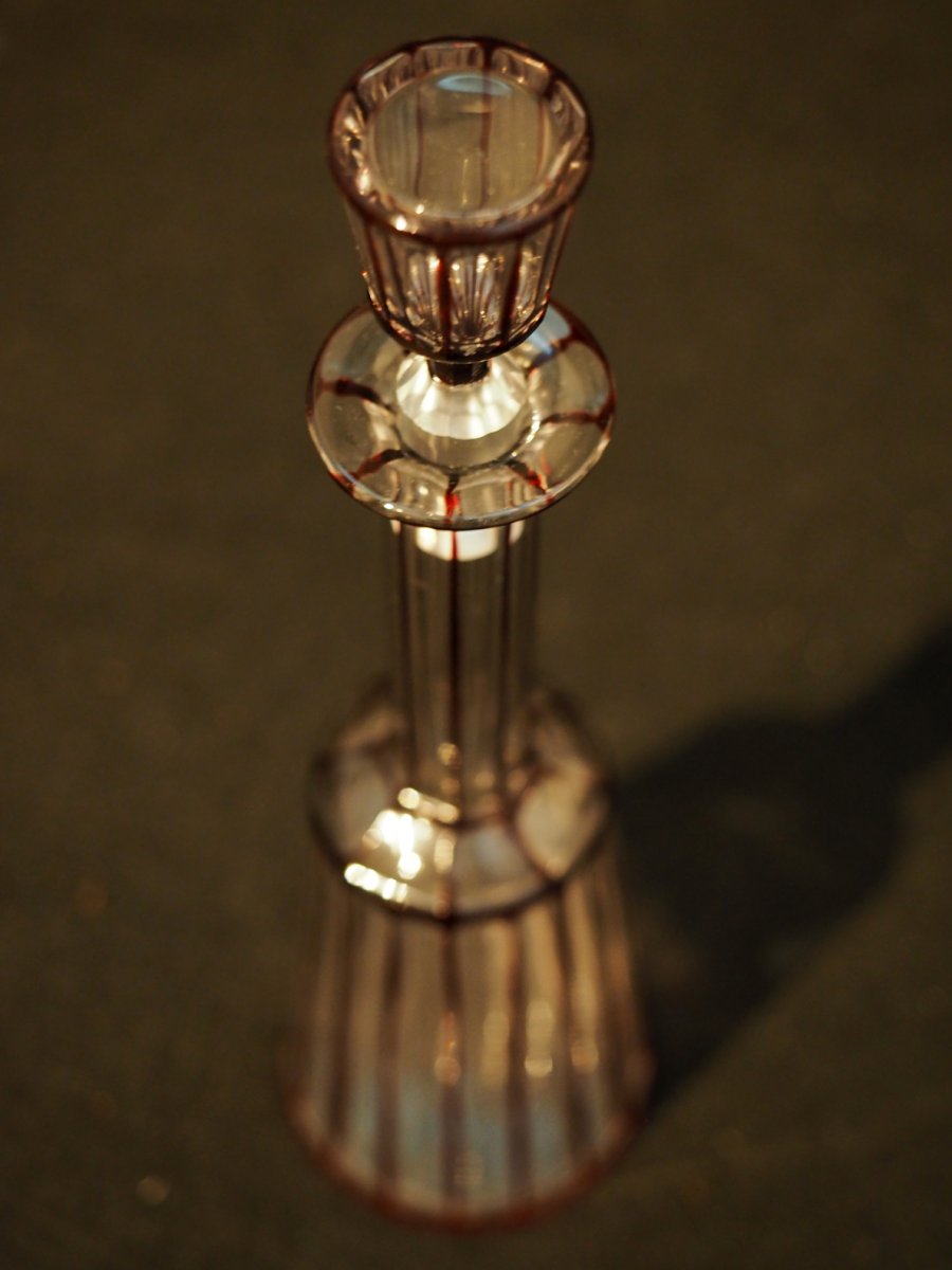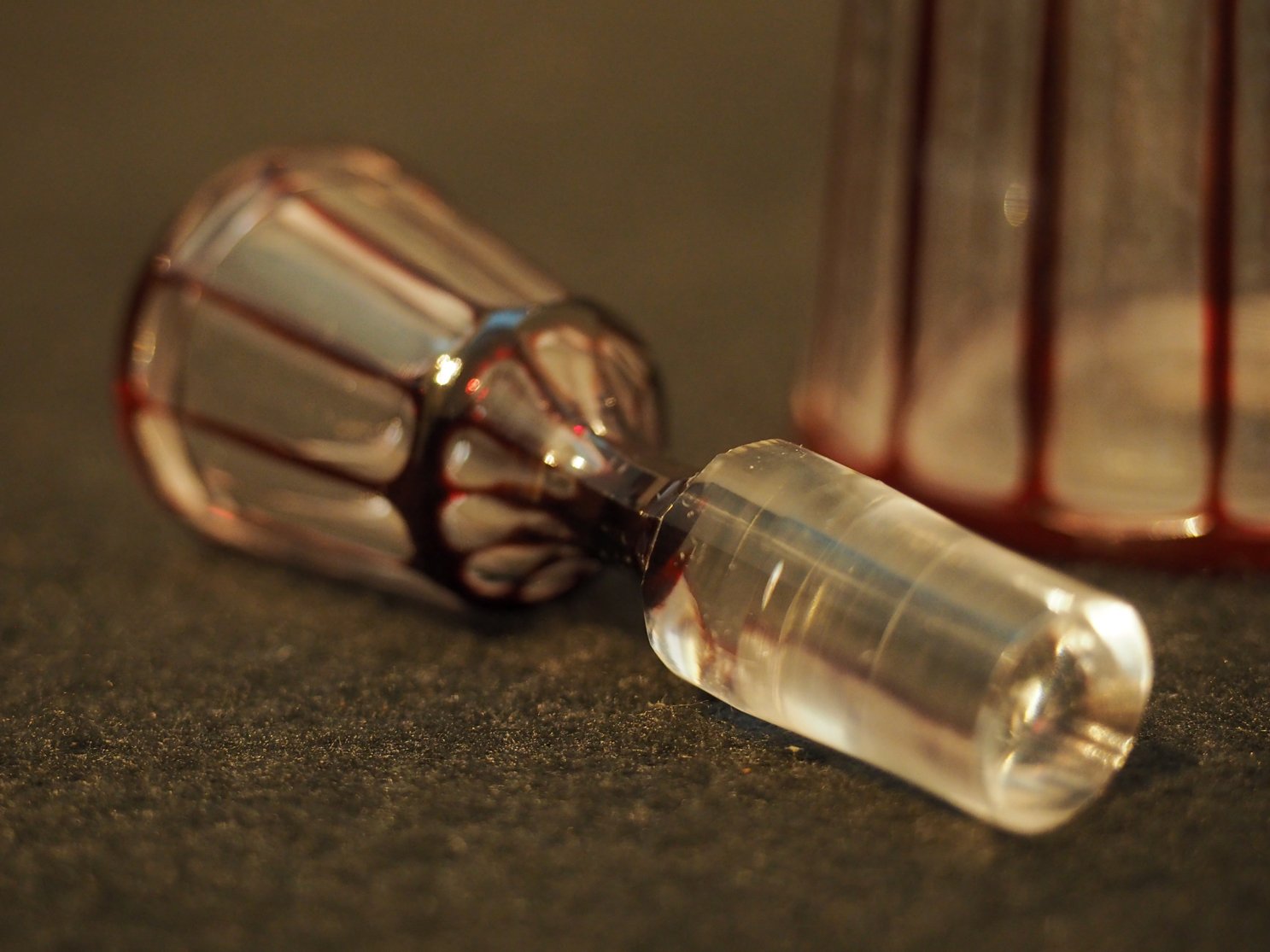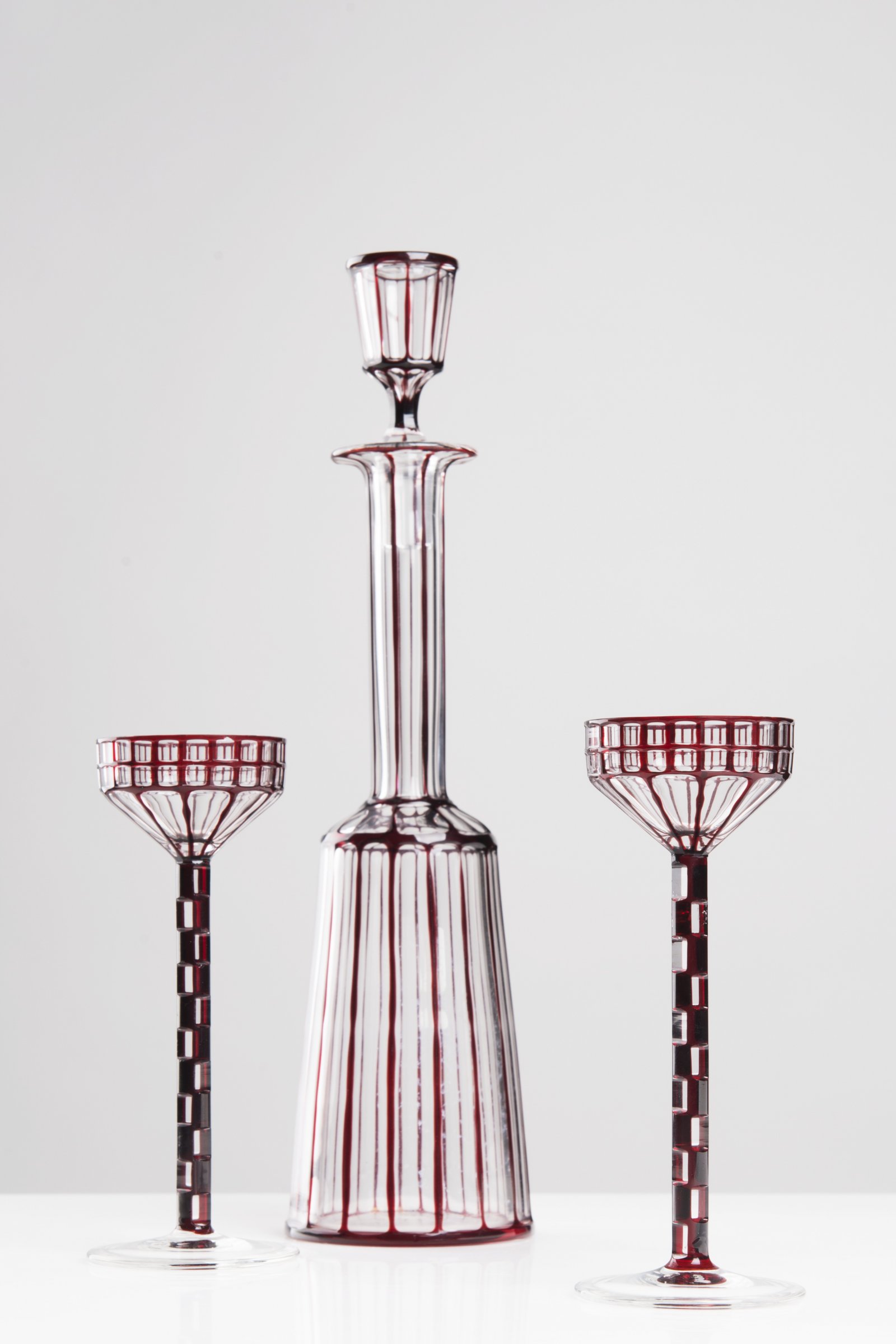 Otto Prutscher was an important Viennese architect and designer, one of the head furniture and decorative art designers at Wiener Werkstätte. Prutscher’s liqueur set, comprising a carafe and two liqueur glasses, is part of a series of drinking glasses featuring a geometric pattern in Viennese Secession style. Available in a variety of colors, the series was produced at the Bohemian glassworks of Josef Meyr’s Neffe in Adolfov/Winterberg from 1907. Colorless glass layered with ruby glass, ground geometric pattern. Carafe: height 28.5 cm, diameter 7.3 cm; liqueur glass: height 14 cm, diameter 5.6 cm.