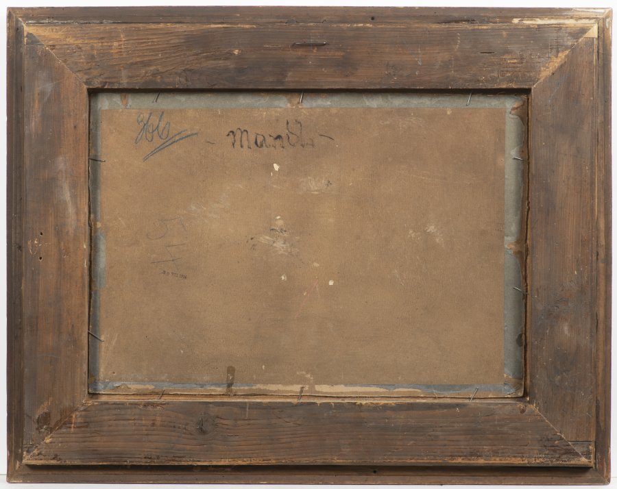 A poetic theme of two lovers in the Petřín gardens resting in the shade of a tree. The beautiful view of the Prague skyline is complemented by masterful work with light and a natural casual nude figure in an atmosphere of human intimacy and quiet moments of contemplation. The sunlit scene acts as a luminous and relaxed contrast in comparison with Josef Mandl's decadent scenes.